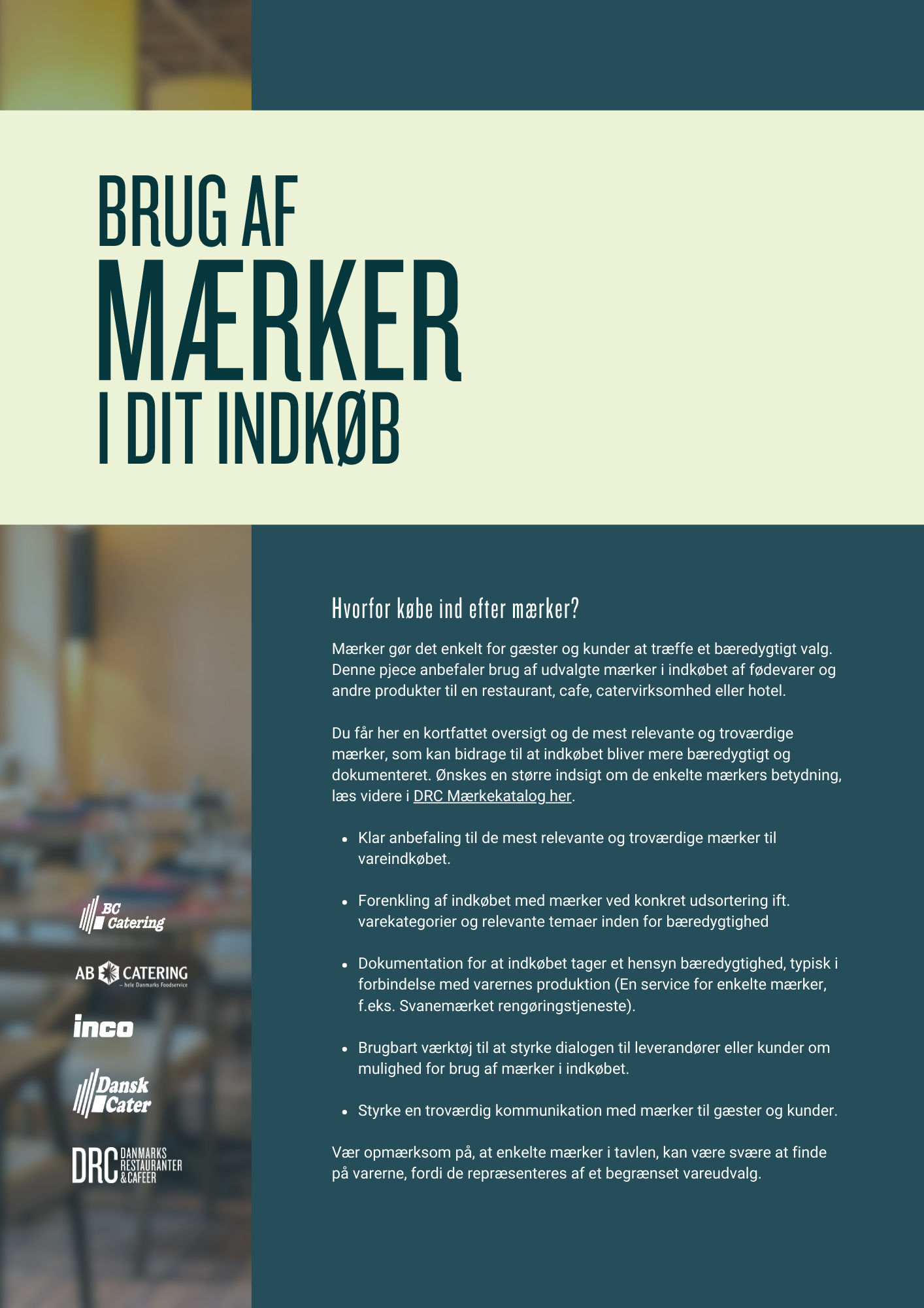 Dette mærkekatalog samler de mærker, certificeringer og standarder (i dette katalog kaldet ”mærkeordninger” eller blot ”mærker”) som Restaurationsbranchen kan bruge til at arbejde frivilligt med bæredygtighed.